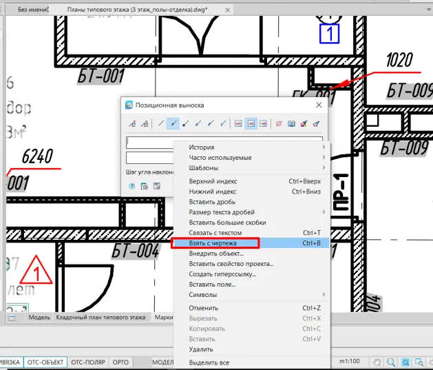 2. В появившемся окне настройки выноски щелкаем правой кнопкой мышки на поле ввода значений и выбираем из списка Взять с чертежа (рис. 13).