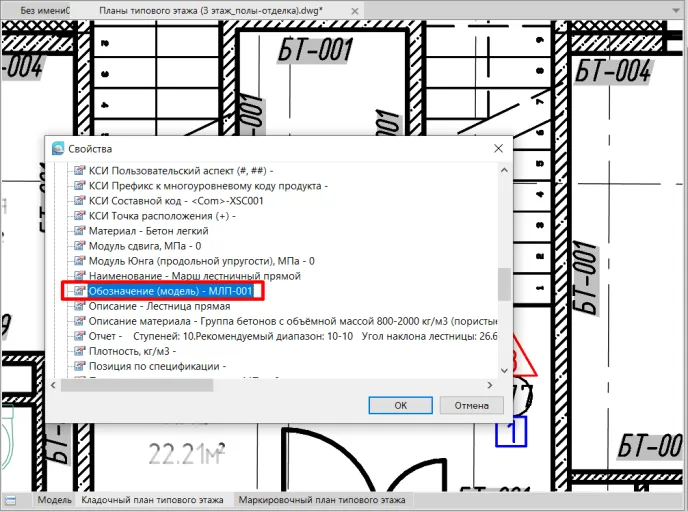 4. После этого выбираем в модели BIM-объекта, параметр которого нам необходимо отобразить в нашей выноске. Для примера, выберем лестницу. Подтверждаем наш выбор, нажав клавишу ENTER. В уже знакомом нам окне Свойства с перечнем всех доступных параметров лестницы выбираем нужный параметр Обозначение (модель) (рис. 15) и нажимаем ОК.