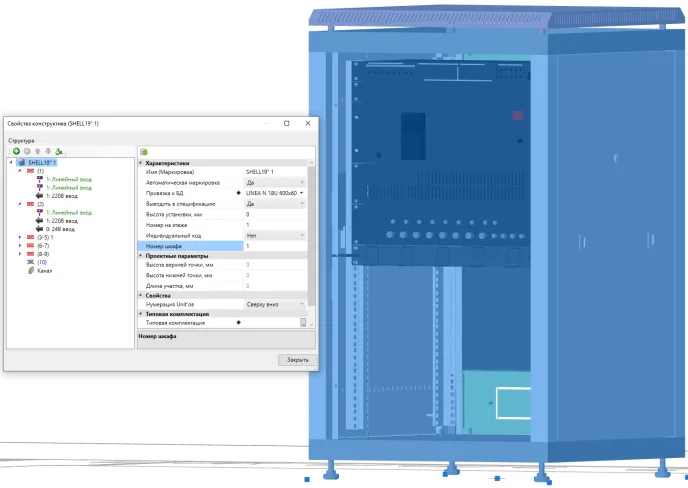 - Визуализация: формирование 3D-вида 19" монтажного шкафа и установленного в нем оборудования.