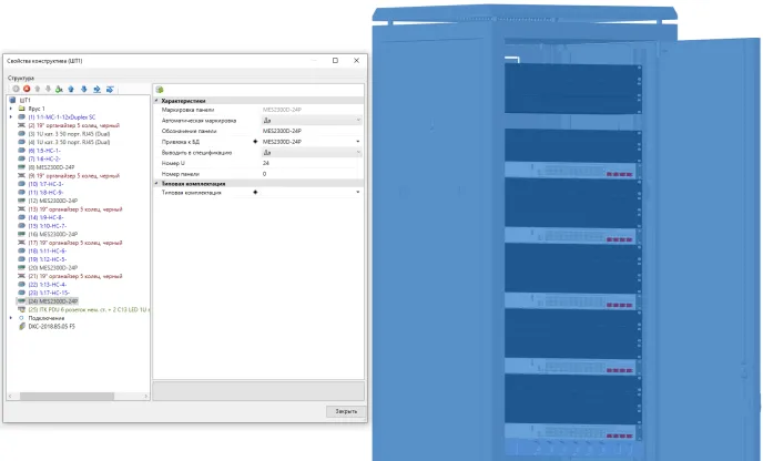 - Визуализация. Формирование 3D-вида 19” монтажного шкафа и установленного в нем оборудования.