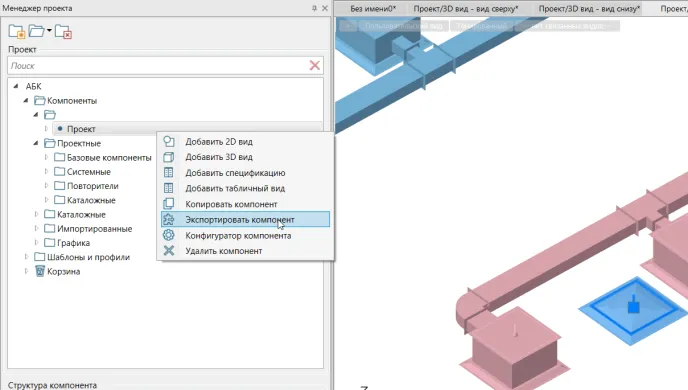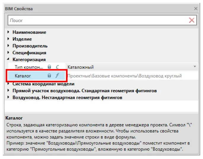 BIM-свойство «Каталог» размещает компонент в Менеджере проекта по предпочтениям пользователя.