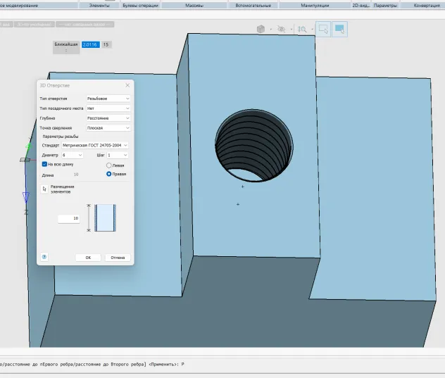 Для создания резьбового отверстия используется команда Отверстие [2] (табл. 1).