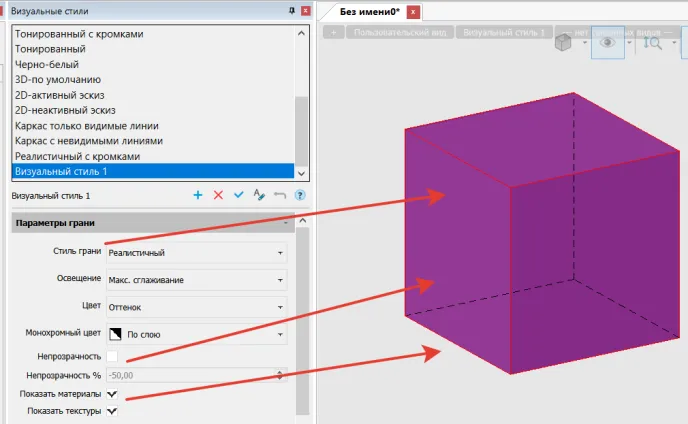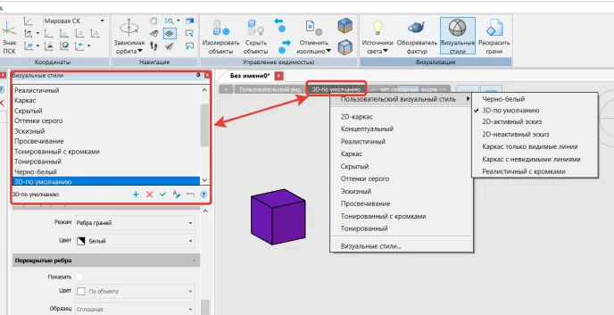 Если необходимо изменить отображение объекта и рабочей зоны, то важно понимать назначение двух ключевых настроек: обозревателя фактур и визуальных стилей.