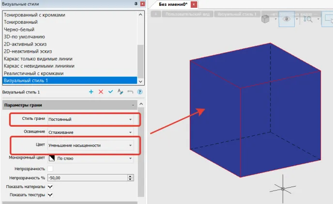 После создания нового стиля переходим к его настройке. В первой группе параметров Параметры грани задаются характеристики поверхности объекта.