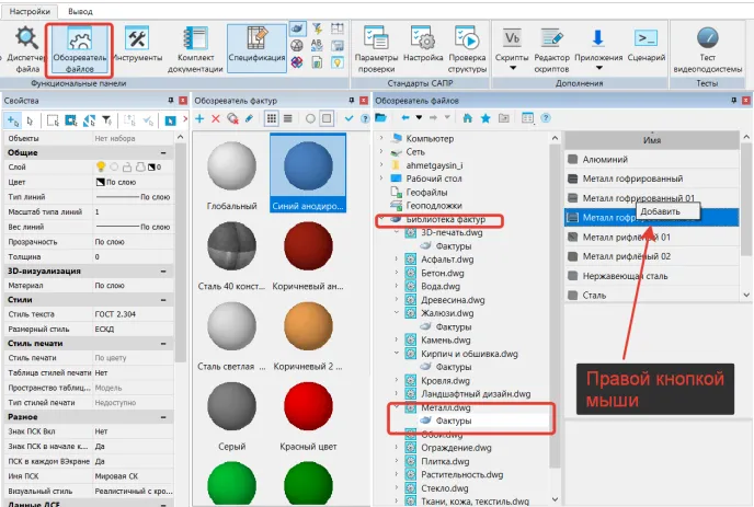 Запрещено иметь одинаковые названия у разных фактур. Поэтому лучше фактуры не создавать с нуля каждый раз, а положить в одном месте и потом добавлять их через Обозреватель файлов, см. рис. 20. Так можно заимствовать из Библиотеки фактур и другого файла.