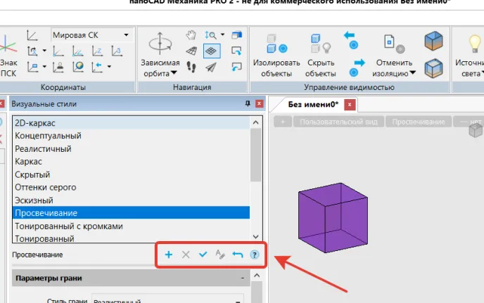 Для стилей по умолчанию имеется команда вернуть в первоначальное состояние – эта функция полезна, если вы изменили стили по умолчанию и хотите вернуть их в исходное состояние. К сожалению, функция вернуть в исходное состояние возможна для стилей Платформы nanoCAD, для Механики PRO установлен сразу стиль 3D-по умолчанию и для него нет такой возможности. Поэтому если хотите настроить свой стиль, то создайте новый через команду «+». Дополнительная информация представлена подробно в справочной системе, для этого нажмите на знак вопроса.