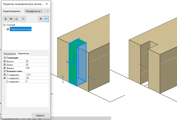 При выборе этого объекта он автоматически принимает размеры 100×100×100 мм и добавляется к текущей балке. Чтобы вычесть объект, следует нажать на знак «минус» в окне редактора модификатора. Полученный куб и его параметры показаны на рис. 34.