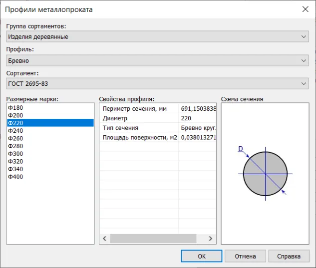 Теперь выберем размер. Для построения примера понадобится бревно диаметром 220 (рис. 5) по ГОСТ 2695-83. Задаем ему соответствующий материал (рис. 6).