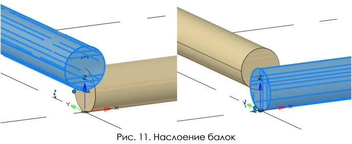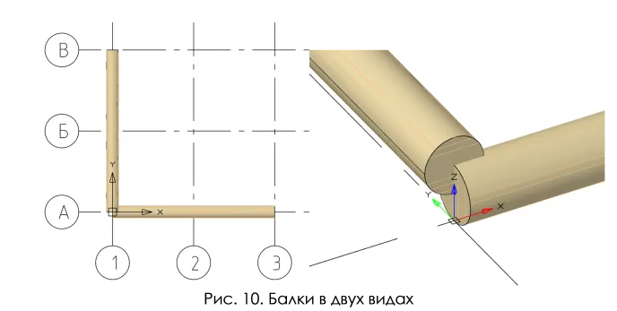 Покажем на примере, как строятся простейшие стены с использованием брусьев. На предварительно заданные оси поставим два бревна, одно из которых будет на 110 мм выше базовой точки (рис. 10).