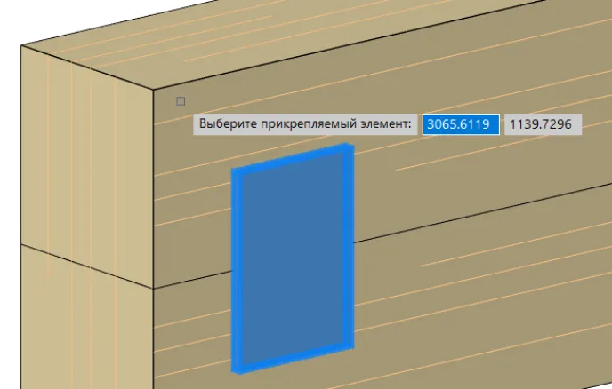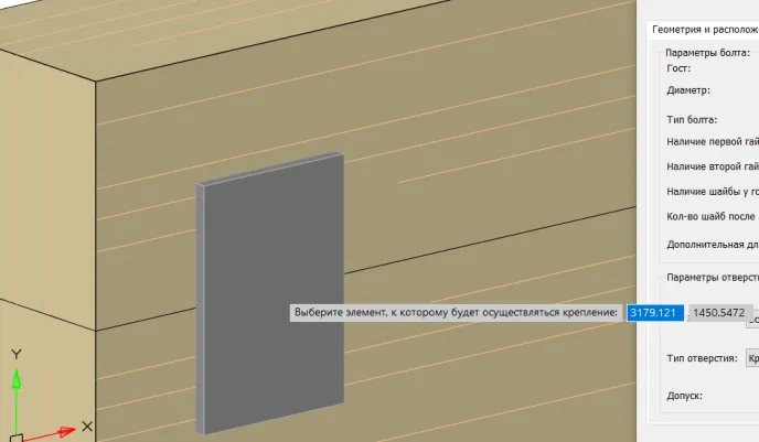 Выбираем в окне требующиеся параметры, нажимаем Создать, появляется динамический ввод «Выберите элемент, к которому будет осуществляться крепление» (рис. 42). Далее понадобится выбрать прикрепляемый элемент (рис. 43) и, при необходимости, – промежуточные элементы проката в пакете соединения (рис. 44).