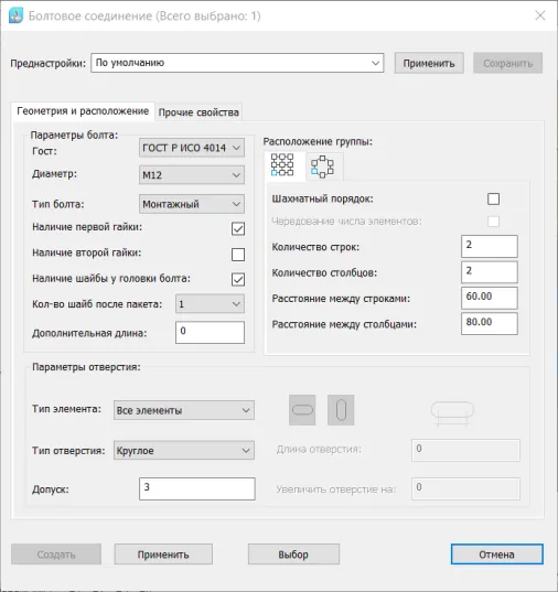 В разделе Параметры болта можно настроить ГОСТ болта, его диаметр, тип, наличие гаек и шайб, а также дополнительную длину болта. В разделе Расположение группы – выбрать тип раскладки болтов (шахматный или круговой), количество строк и столбцов, расстояние между строками и столбцами.