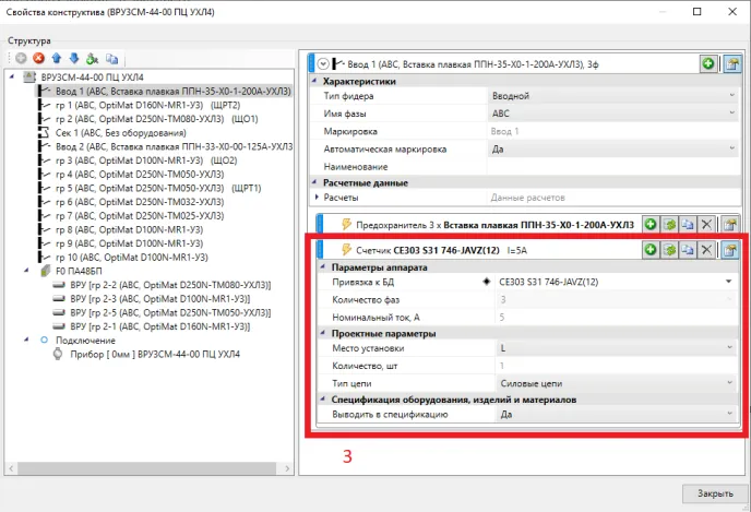 В структуру щитового оборудования (см. рис. 3) добавляем доп. оборудование. Выбрав необходимый фидер (1) в свойствах фидера выбираем Добавить оборудование (2). Из БД оборудования (см. рис. 4) добавляем необходимый элемент (3). Добавленное оборудование показано на схеме (см. рис. 5).