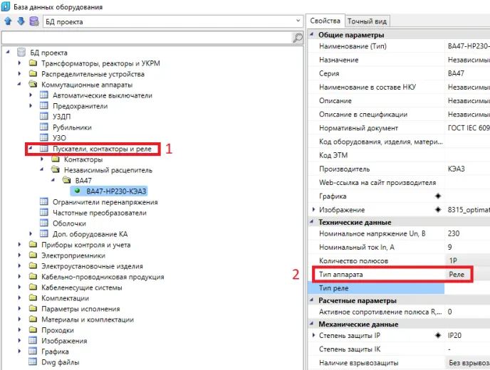- в БД оборудования (см. рис. 6) НР был создан в таблице Пускатели, контакторы, реле (1), так как он будет моделироваться элементом Реле (2).
