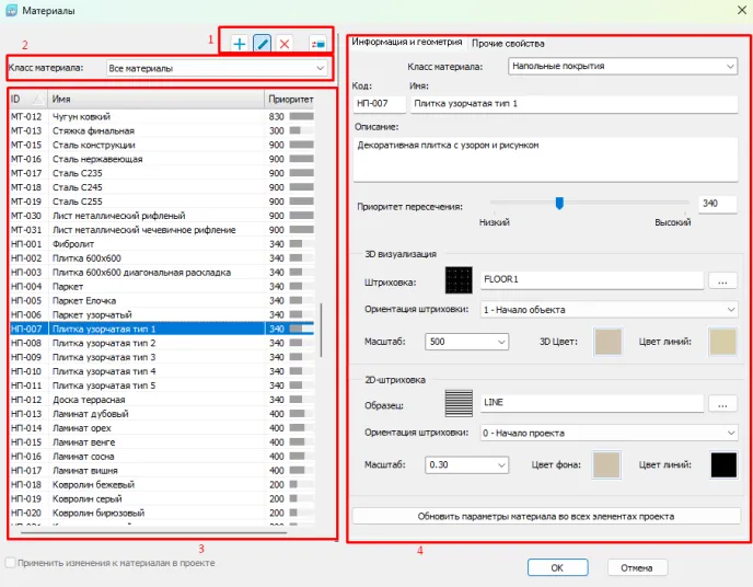 На рис. 4 показано окно работы с материалами проекта в nanoCAD BIM Строительство. Коротко перечислим элементы интерфейса:
