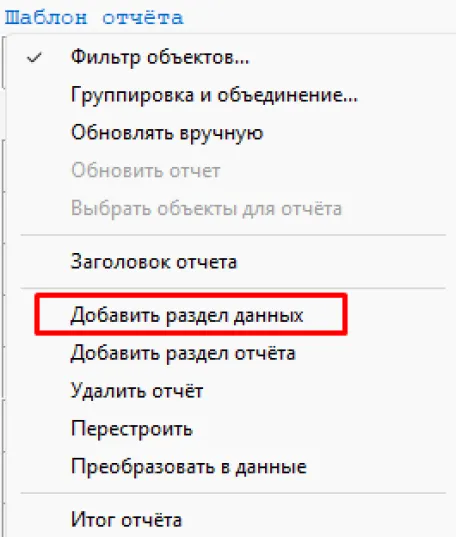 По завершении работы с отчетом возвращаемся к его шапке. Щелкнув ЛКМ по шаблону отчета, открываем контекстное меню и выбираем команду Добавить раздел данных (рис. 35).