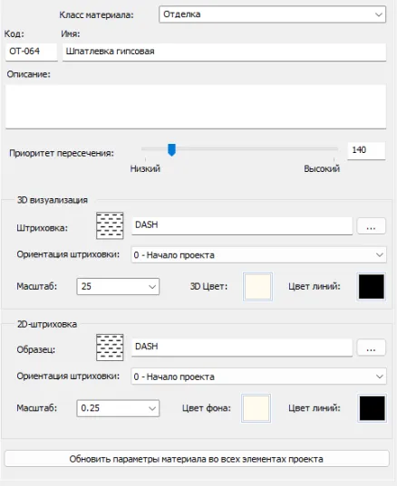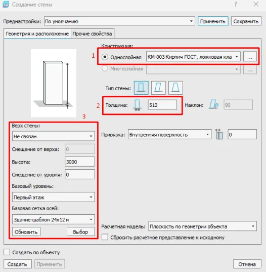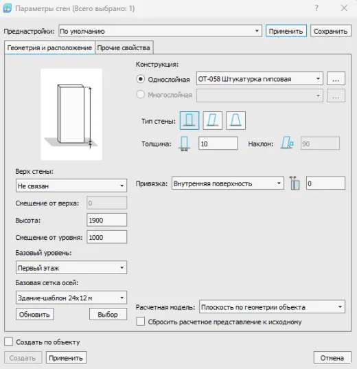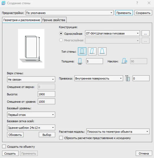 1 – вкладка Конструкция окна Создание стены позволяет настраивать материалы стен, их отображение в модели, а также приоритеты подрезки.