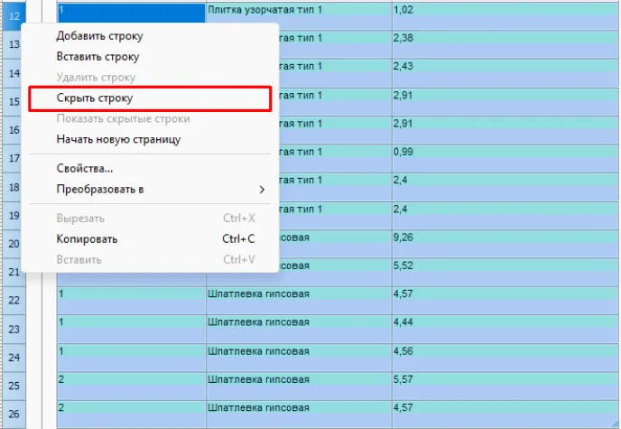 Чтобы привести таблицу к более корректному виду, выделяем в редакторе таблицы строки с данными отчета, щелкаем ПКМ и выбираем в контекстном меню команду Скрыть строку (рис. 45).