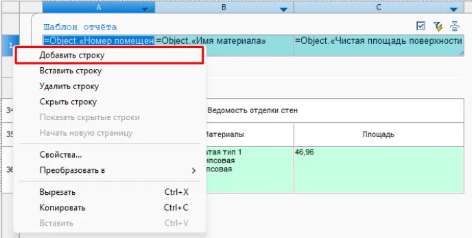 Следующим шагом переходим к части таблицы с итоговыми данными и создаем общий отчет отделки. В каждую ячейку строки с данными берем значения из ячеек отчета. Формирование значений в ячейках таблиц nanoCAD происходит по тому же принципу, что и в таблицах Excel (рис. 39).