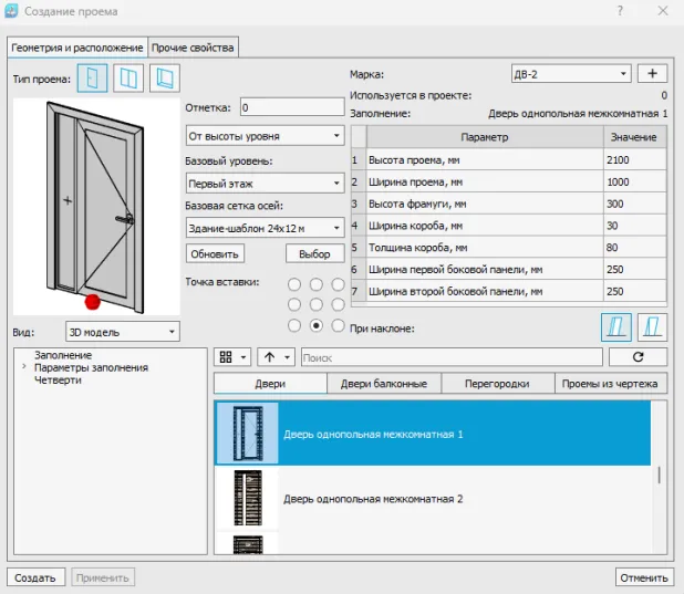 В открывшемся окне Создание проема выбираем вкладку Двери и находим проем Дверь однопольная межкомнатная 1 (рис. 19).