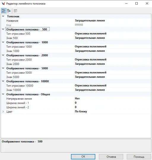 После этого появится окно Редактора линейного топознака, в нем мы можем выбрать отображение для разных масштабов. Для стандартной полилинии надо указать непрерывна она или нет. Также для линии можно указать ее ширину (где 1 отвечает за масштабы с 500 по 1000) и цвет. Вы можете отрисовывать линейный УТЗ тополинией или стандартной полилинией (рис. 15).