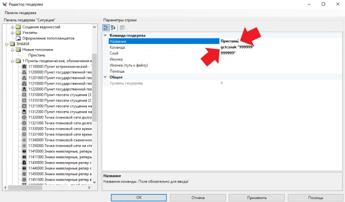 Теперь создадим команды для самих новых УТЗ. Так, же как и раньше, щелкнем ПКМ на нашу команду Новые топознаки и выберем Создать дочернюю команду (обращаю ваше внимание, что у команды Новые топознаки появилась иконка папки для удобства). Выбирая новую команду, мы изменяем ей Название для примера я создам УТЗ Пристань. Далее в поле Команда необходимо прописать gctcznak и в кавычках придумать ей уникальный код (рис. 7). Этот код автоматически будет учтен в дальнейшем в другом редакторе и будет обозначать графическое отображение знака, которое вы сможете отредактировать.