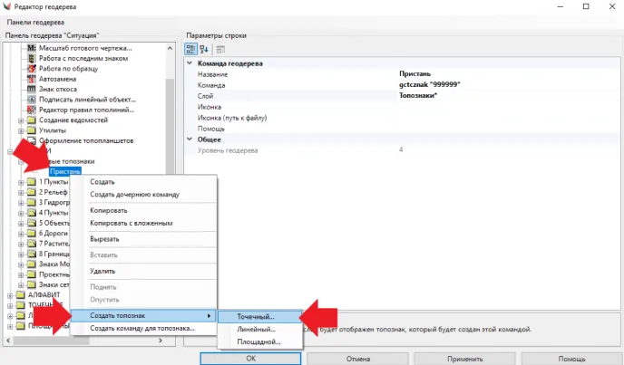 Однако мы еще не закончили создание точечного УТЗ. Так как теперь надо определить, что мы создали команду именно для точечного УТЗ. Для этого щелкнем ПКМ на нашей команде Пристань, переведем мышку на закладку Создать топознак... и выберем Точечный... (рис. 8)