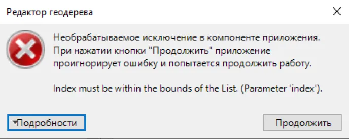 Важно! Если вы удаляли существующие или добавленные ранее команды с момента запуска Редактора геодерева и с тех пор не закрывали его, подтверждая изменения кнопкой ОК, то при попытке изменить положение новой команды появится ошибка необрабатываемого исключения (рис. 6). Чтобы устранить эту ошибку, выйдите из Редактора геодерева с помощью кнопки ОК и откройте его заново.