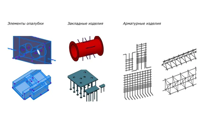 Комплексные параметрические объекты позволяют решать не все задачи. Разработать один параметрический объект, отвечающий всем требованиям, невозможно, а значит требуется использовать дополнительные простые элементы. Пример представлен на рис. 4: для фундаментов или неподвижных опор с отверстиями разного диаметра следует применять набор одиночных арматурных изделий. В итоге получаем опору, собранную из различных элементов (рис. 5).